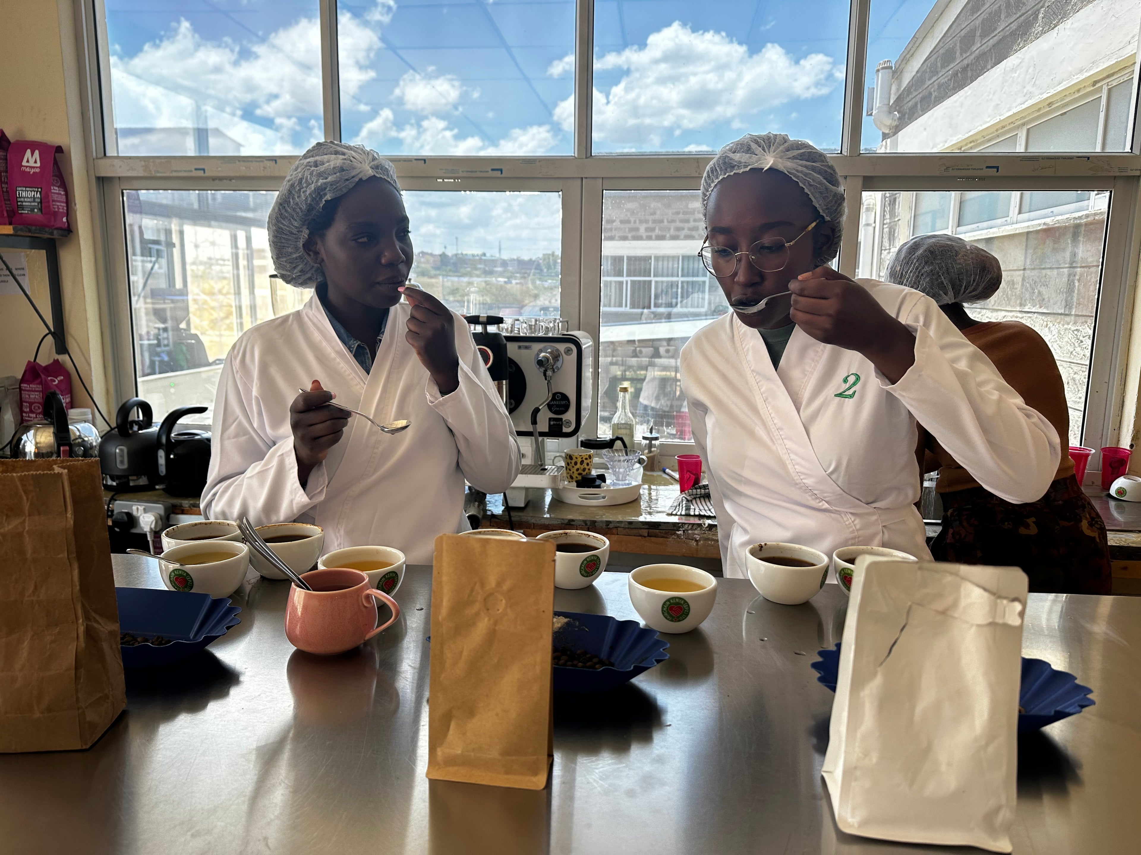 Sampling our coffee after roasting to ensure quality!